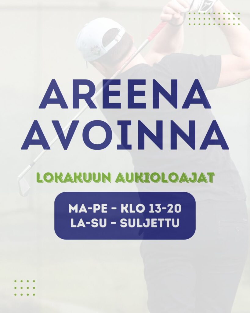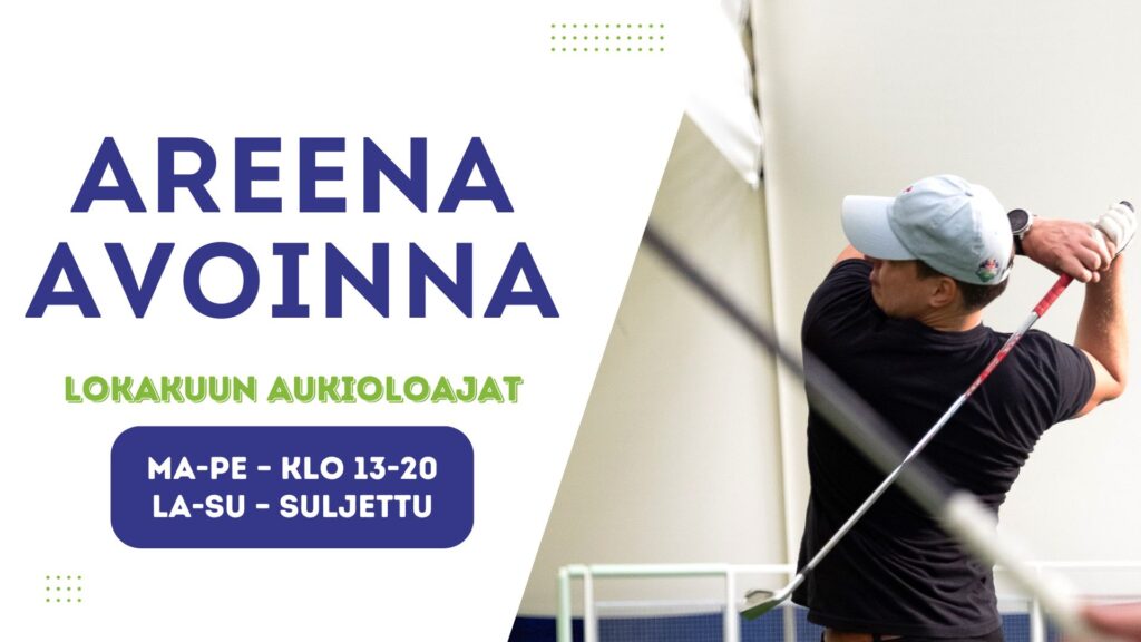 Areena avaa ovensa keskiviikkona 15.10. klo 13 ja kutsuu kaikki golfarit jatkamaan harjoittelua laadukkaissa olosuhteissa. Ajanvarauskalenteri avataan maanantaina 13.10.